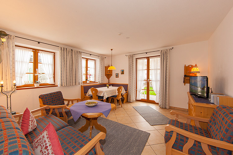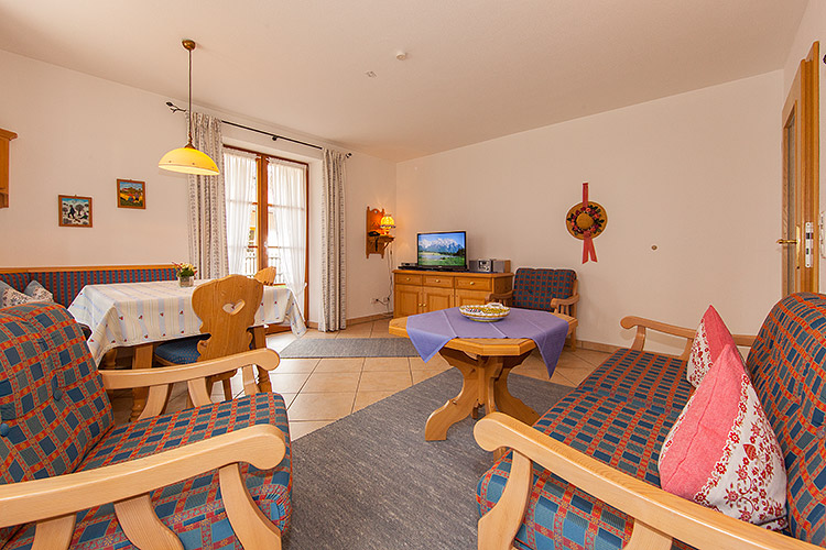 sich im Parterre mit möblierter Terrasse und Liegewiese und herrlichem Ausblick auf das Wettersteingebirge.