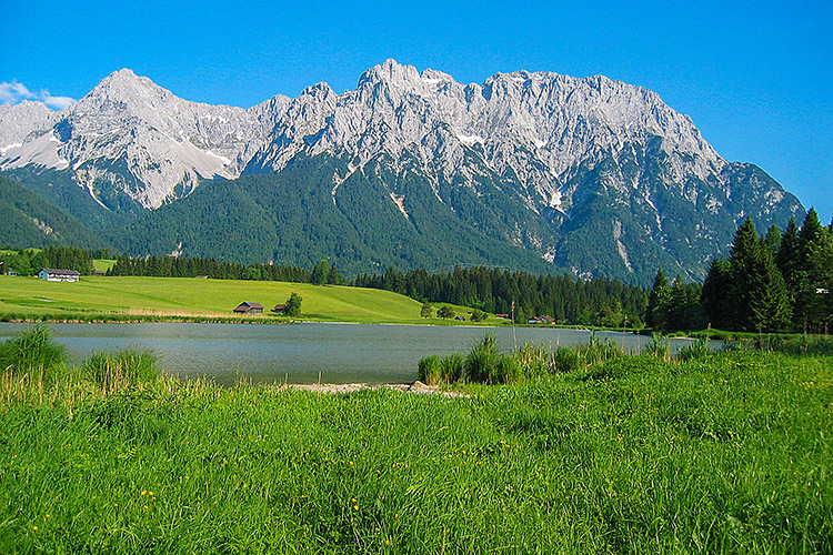 Blick auf Badeanstalt am Lautersee und Karwendelgebirge